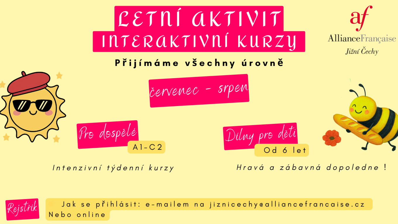 Jazyk je potřeba procvičovat – a to i v létě! Ať už chcete začít s francouzštinou od nuly, udržet si svou úroveň, zlepšit se, nebo se připravit na nový školní rok, nabízíme letní kurzy právě pro vás. 🍓 Ať jste dospělí či děti, úplní začátečníci nebo pokročilí, naše kurzy jsou navrženy tak, aby vyhovovaly vašim potřebám. 🌻